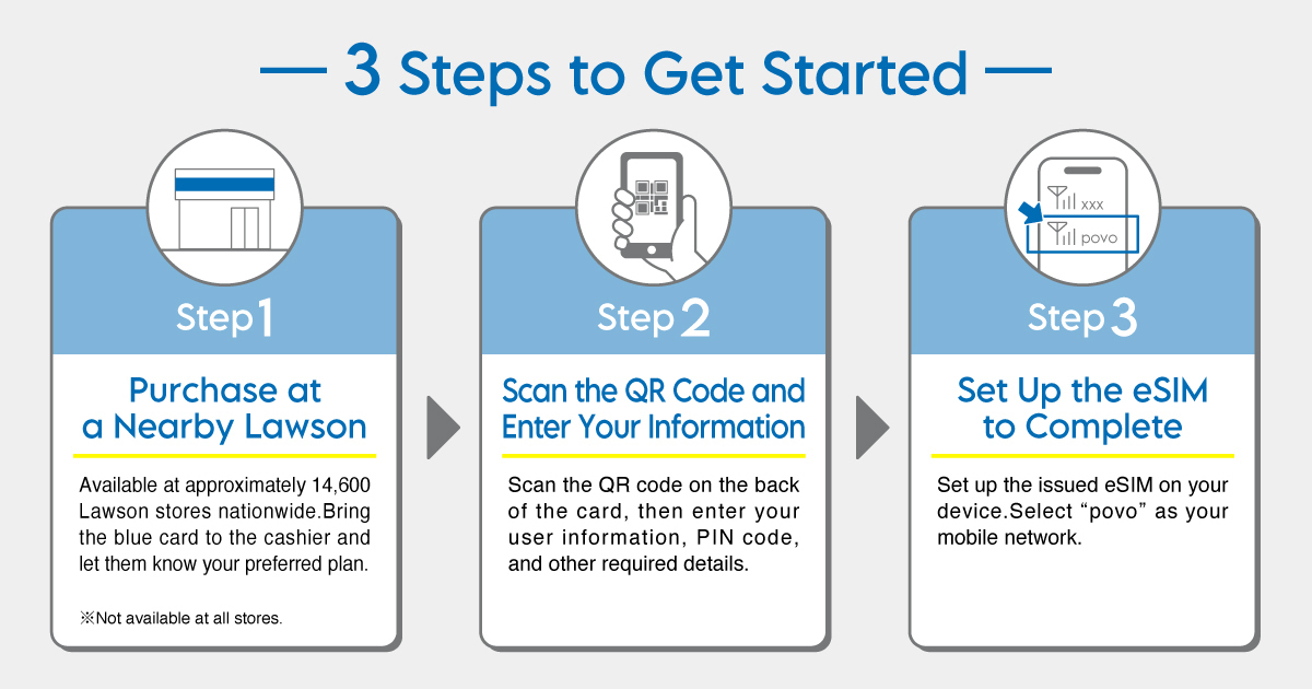 KDDI has announced that starting July 1, 2025, “povo2.0 Japan SIM” cards, which allow foreign travelers to purchase data, will be available at approximately 14,600 Lawson locations (note 1) across Japan, a major convenience store chain in Japan. Travelers can choose from four plans based on their needs: 3 GB (7 Days), 10 GB (30 Days), 25 GB (30 Days), and Unlimited Data (7 Days) (note 2). They can be purchased at the register with cash and utilize the eSIM card embedded in the customer’s device, so they can register online and connect to the internet in as little as three minutes (note 3).